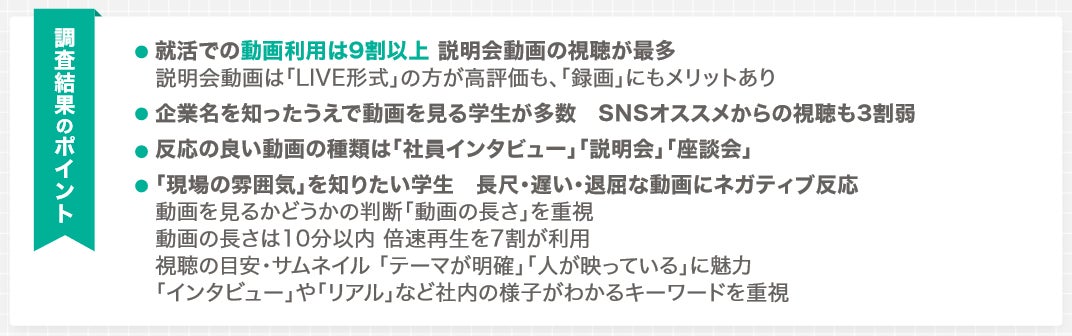 調査結果では、9割以上の学生が就活に動画を積極的に使用している状況が分かったほか、好まれるコンテンツの傾向から「現場の雰囲気」を知るためのツールとして期待されていることがわかりました。