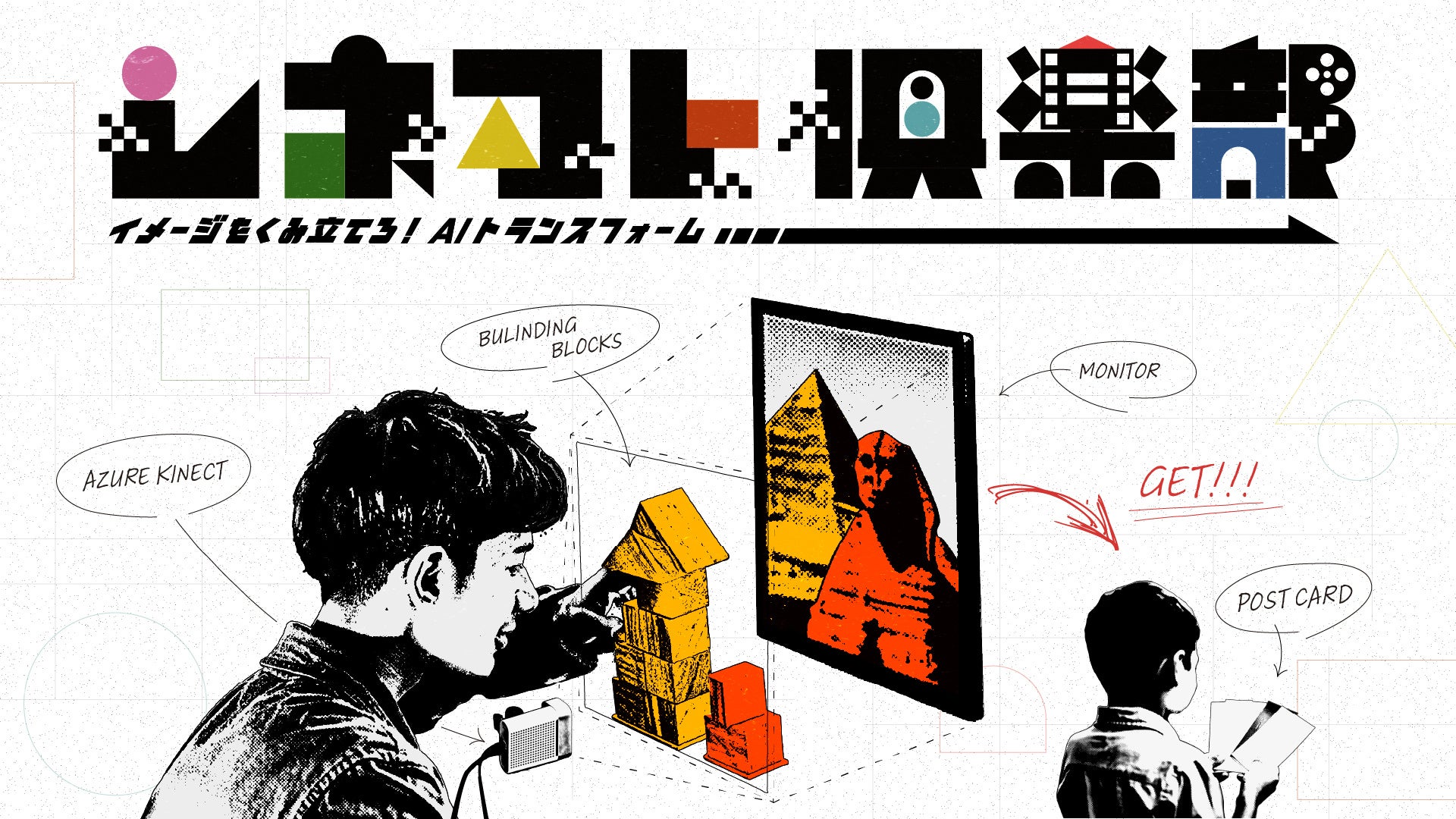 シネマト倶楽部は、組み立てた積み木などの立体物を、AI技術を駆使して映画さながらのセットへと変換するコンテンツ。生成されたセットは、AIがタイトルとストーリーを付与し映画ポスター画像として出力。この画像はポストカードとして持ち帰りできます。