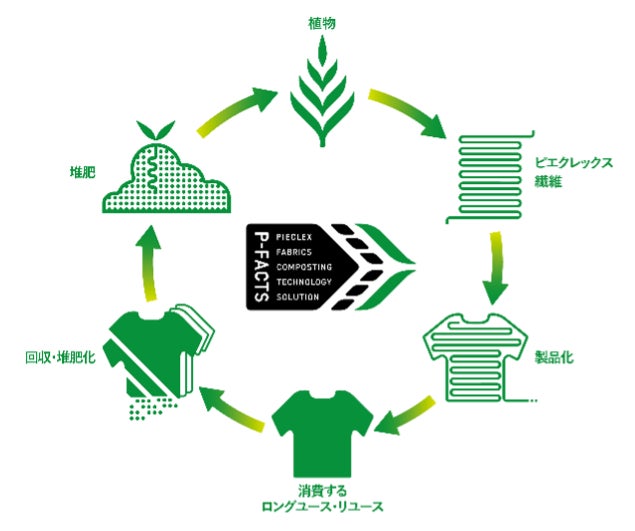 「P-FACTS」(PIECLEX FAbrics Composting Technology Solution)は、ピエクレックス社が主導し、植物由来のポリ乳酸を原料とした素材である「電気の繊維」ピエクレックスを使用したアパレル製品や繊維製品を回収し、林業や農業での利活用を目的とする堆肥化までを、パートナー企業、自治体、福祉施設、学校法人等、多くのステークホルダーと連携・共創し構築した、透明性高い循環インフラです。