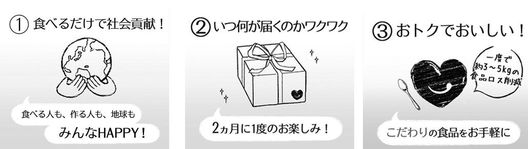 その現状に着目した私たちは、「まだ安心して食べられる食品を消費者のお口に入れたい」と考え、サブスクを開始しました。消費者も事業者も地球もハッピーになる仕組みこそが、ロスゼロです。
