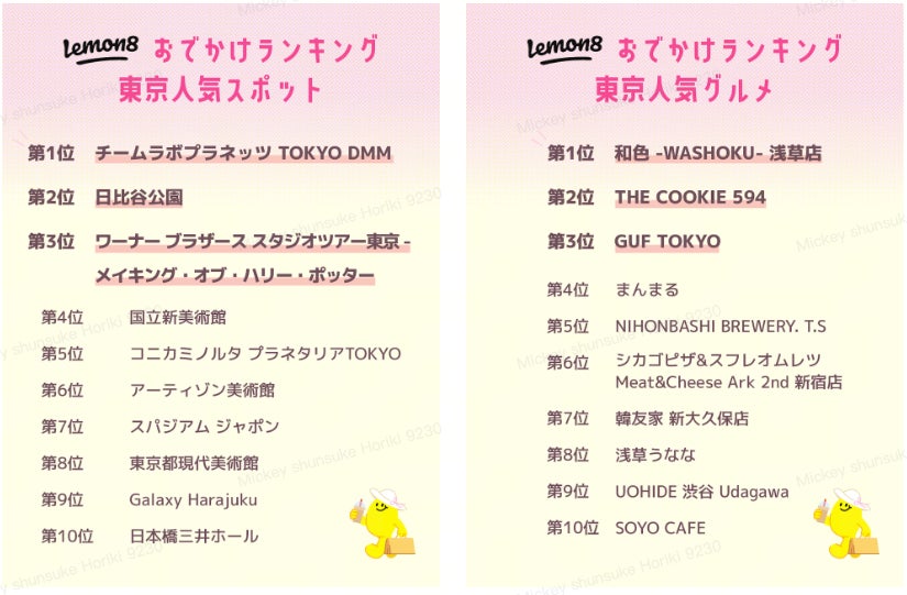 ライフスタイル共有アプリ「 Lemon8(レモンエイト)」は、Lemon8内で1月1日から7月20日に投稿された約21万件の投稿のうち、位置情報をつけた投稿の分析結果を元に、没入できる体験型アートや新オープンのテーマパークなどの人気が急上昇した「東京人気スポット」、カラフルでおしゃれな和食&和スイーツに注目が集まった「東京人気グルメ」という2つのテーマを選出し、各ランキングTOP10を発表します。