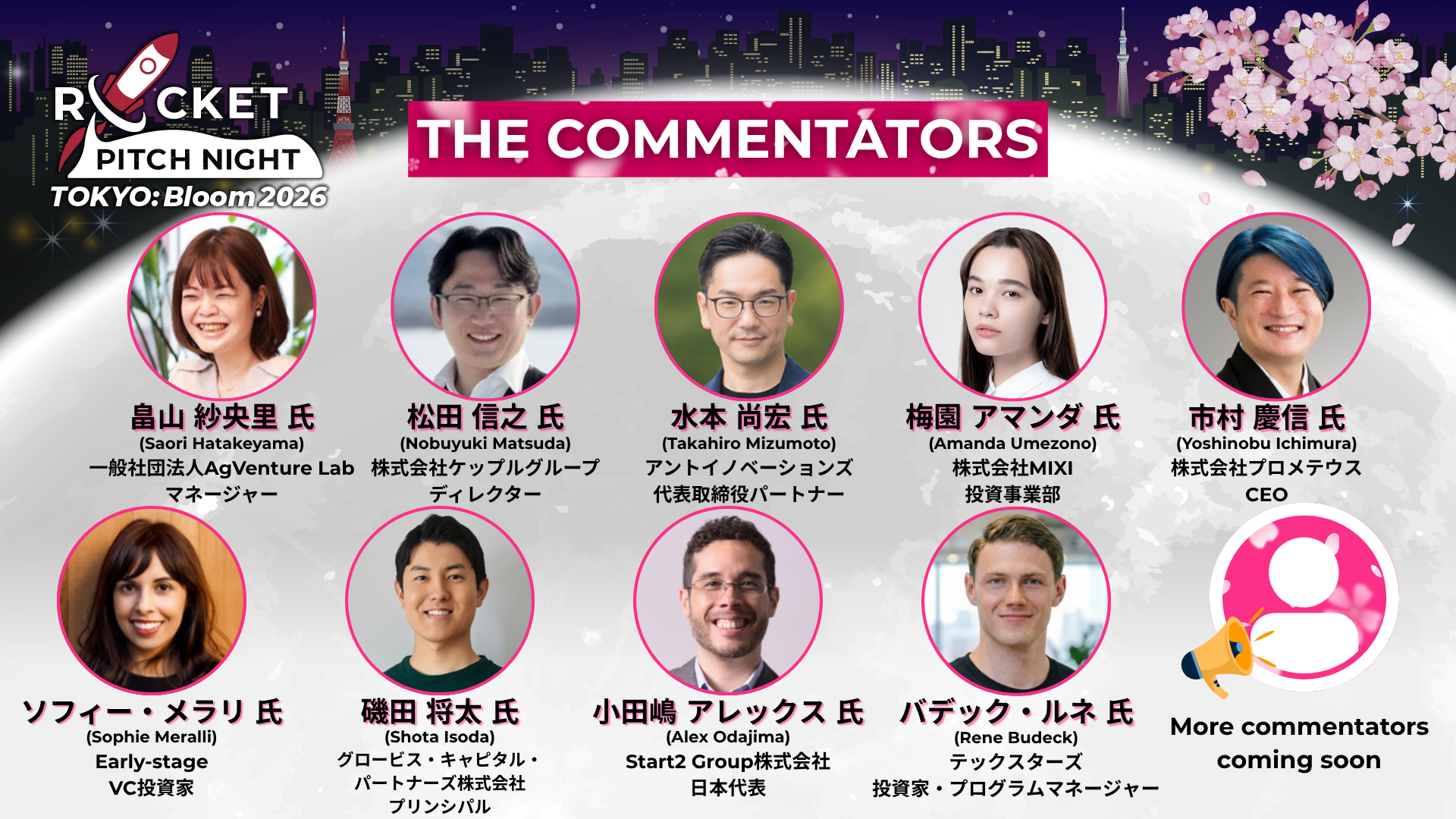 登壇者のみならずコメンテーターのレベルの高さも本イベントならでは。知名度が高く実績のある起業家や投資家、スタートアップ支援者など、豪華なコメンテーター陣が今回も参画予定です。(コメンテーターは順次更新予定です。)