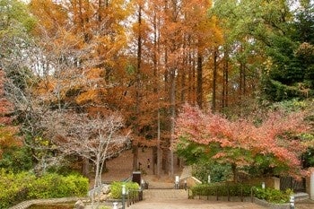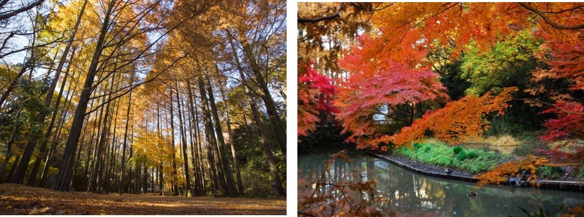 多摩丘陵の地形と里山の自然を生かした園内には、多数の登り坂や下り坂、階段、自然路などが点在しています。例年は11月中旬~12月中旬には、青空と紅色のコントラストが美しいメタセコイアや、日本民家園にある古民家・佐々木家の周辺にあるイロハモミジ等、園内のつくりを活かし、様々な角度から紅葉を楽しむことができます。また、枡形山展望台からは、360度パノラマで広大な紅葉風景を眺めることができ、秋の訪れを感じることができます。