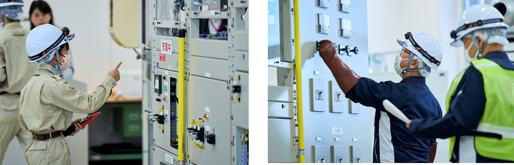 (左)絶縁用保護具の点検(右)停電原因調査前に電気を遮断