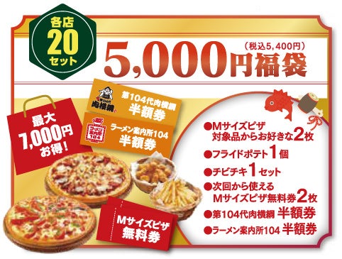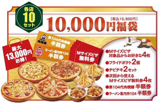 お好きなMサイズピザ2枚、フライドポテト1 個、チビチキ1セット、次回から使えるMサイズ ピザ無料券2枚、第104代肉横綱半額券×1枚、ラーメン案内所104半額券×1枚