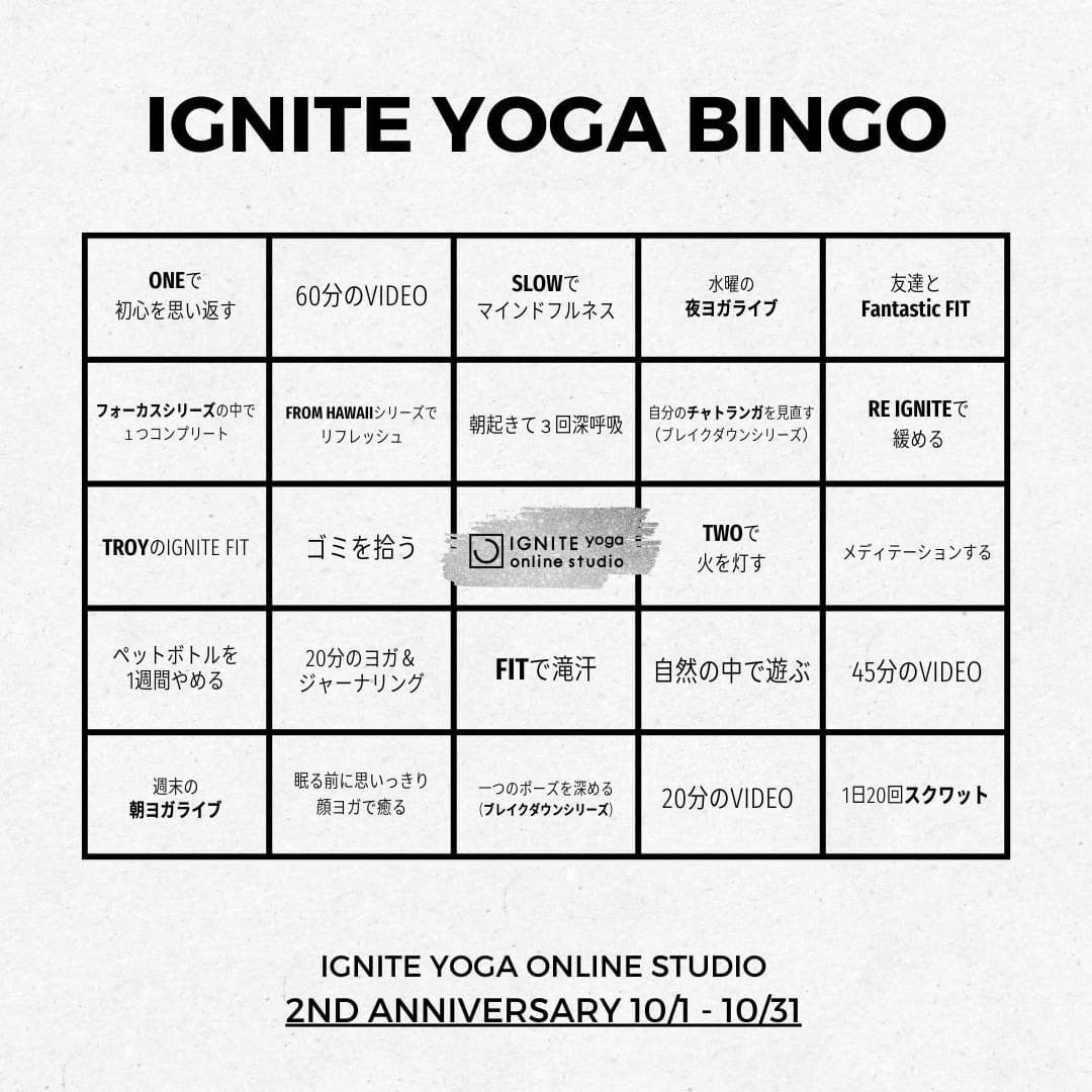 10月1日~31日までIGNITE YOGA BINGOとオンラインスタジオ2週間トライアルフリーキャンペーンも実施中