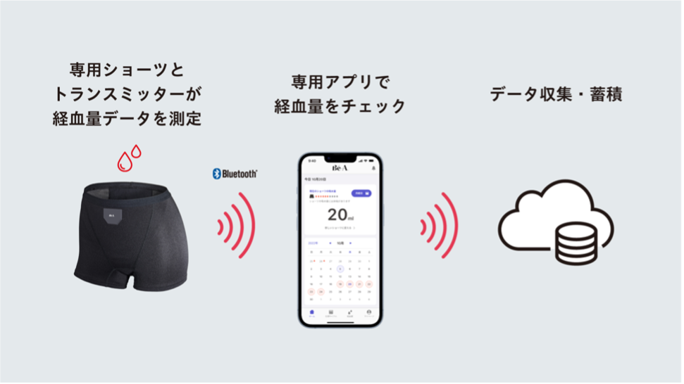 吸水ショーツに液体を吸水させ、トランスミッターを通じてアプリに経血量が表示される一連の使用イメージをお伝えしました。