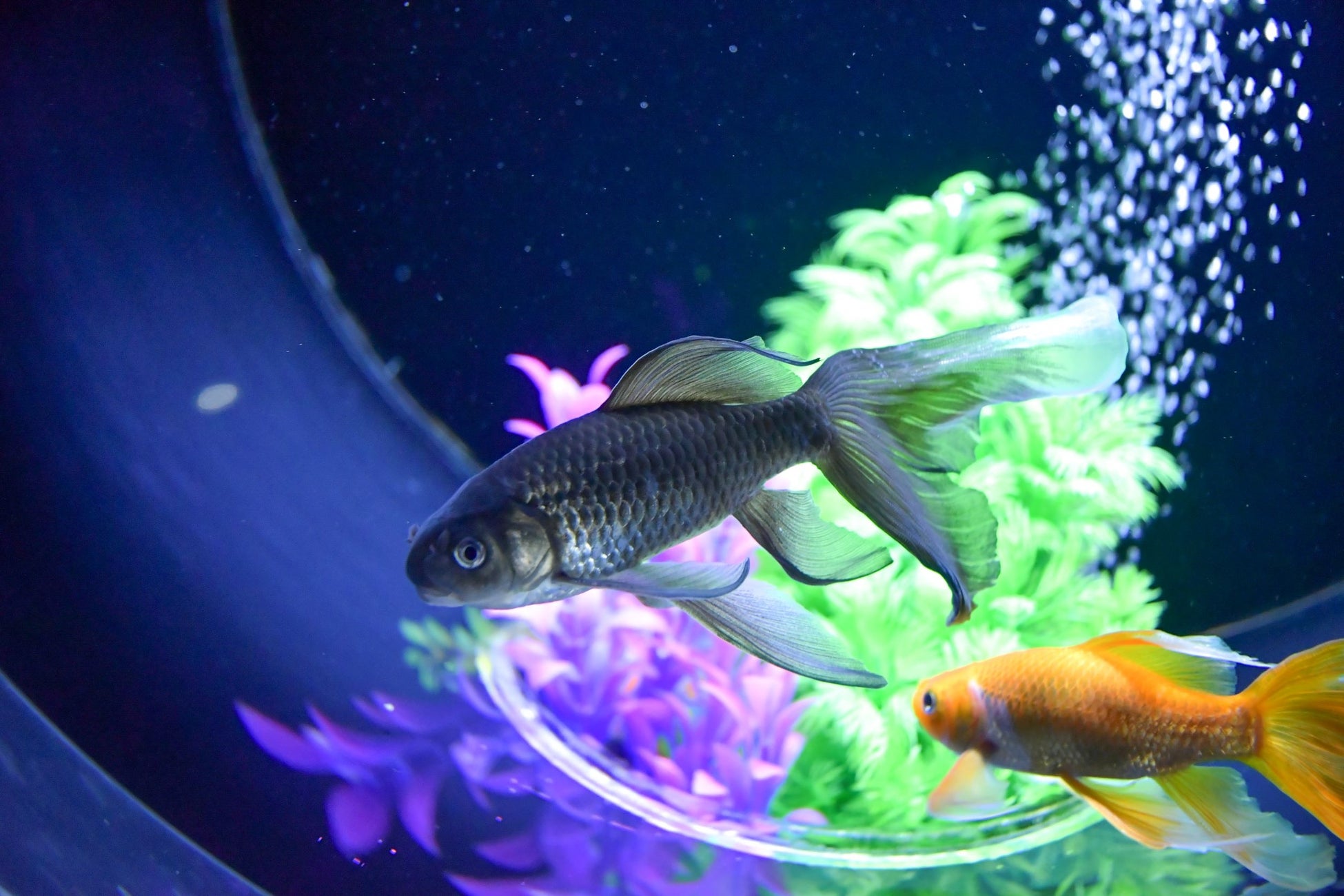 当館では、鉄魚の中でもよりヒレが優雅に長く伸びる“羽衣天女(はごろもてんにょ)”と呼ばれる種類が泳いでいます。