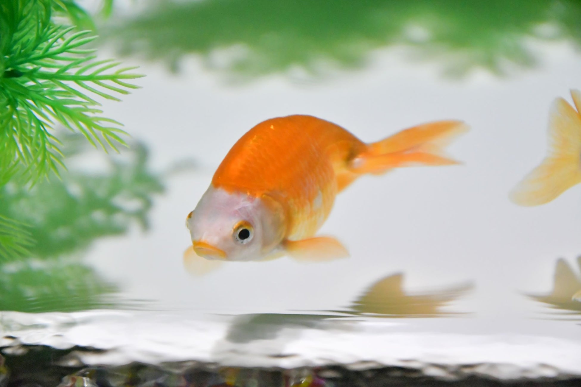 上からの鑑賞でその魅力が引き立つ、透明感のある白い体と赤いひれが特徴。口元は紅を差したように赤く染まっています。