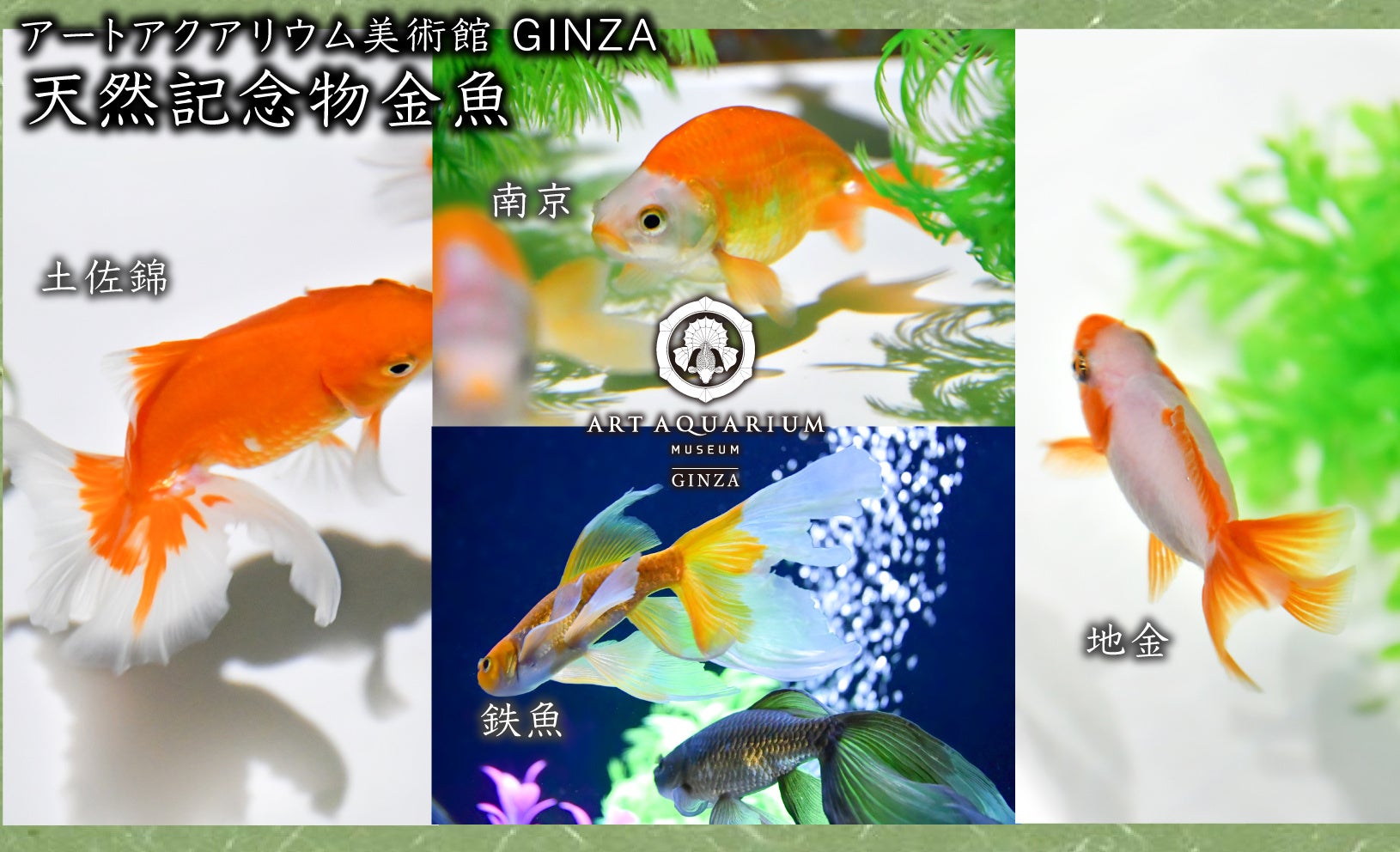 アートアクアリウム美術館 GINZA(所在地/銀座三越)では、江戸時代から続く金魚鑑賞という文化を、芸術作品「アートアクアリウム」として現代に表現しています。当館には約70種類の金魚が様々な水槽作品の中を舞い泳ぎます。この度、日本で天然記念物と指定されている4種の金魚が全て揃いました。代表的な金魚から珍しい金魚までが揃うアートアクアリウム美術館で、金魚という観賞魚の美しさにぜひ触れてみてください。