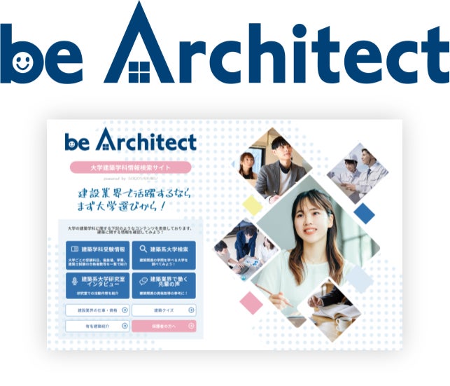 「be Architect(ビーアーキテクト)」は、建設系資格のリーディングスクール「総合資格学院」を運営する当社の大学、高校とのネットワーク、そして建設業界での知見を活かした、当社だからこそ実現できた他に類を見ないポータルサイトです。2024年3月31日からパイロット版として運用を開始し、同年5月15日より本格オープンとなりました。