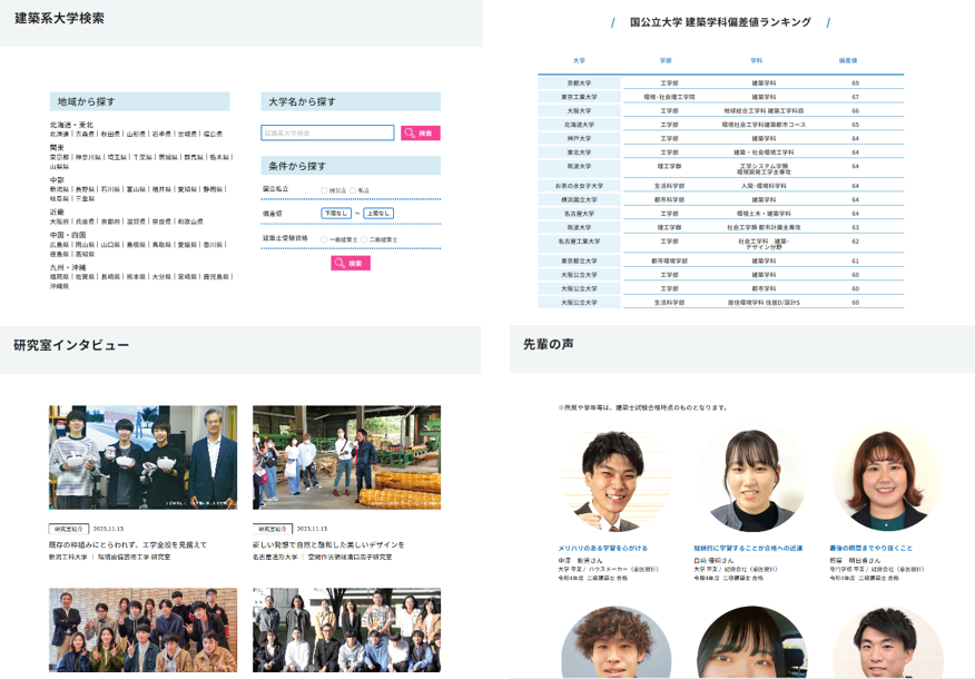 名称、地域、偏差値などの条件検索が可能な「建築系大学検索」、入試情報、学費、偏差値ランキング、一級建築士合格者数ランキングなどを確認できる「建築学科試験情報」をはじめ、「建築系大学研究室インタビュー」「建設業界で働く先輩たちの声」など、高校生の建築への関心がさらに高まるコンテンツも多数ラインアップしています。