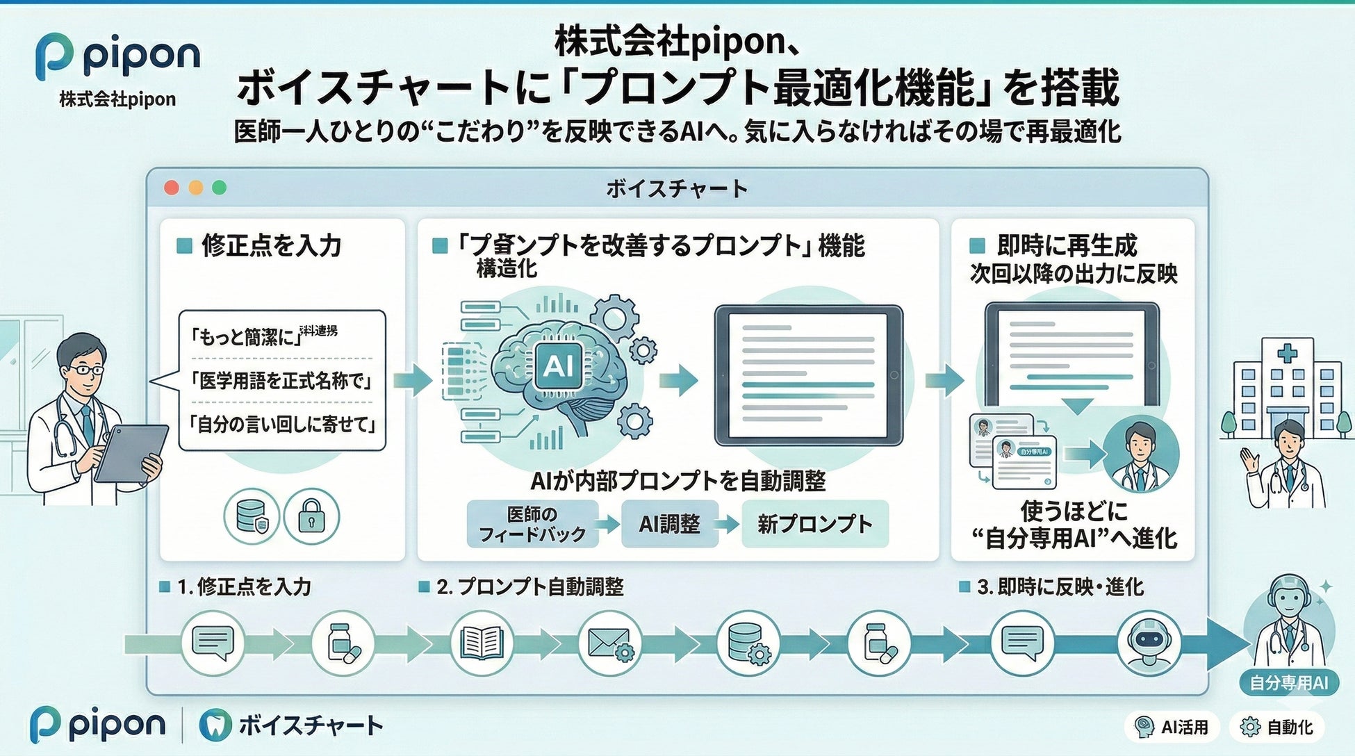 株式会社pipon(本社:東京都中央区、代表取締役:北爪聖也)は、AIカルテ作成サービス「ボイスチャート」に、出力内容を即座に改善できる「プロンプト最適化機能」を搭載したことをお知らせいたします。