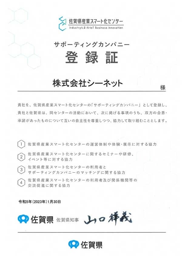 倉庫管理システムをはじめとする物流ソリューションの開発提供を手掛ける株式会社シーネット(本社:千葉県千葉市、代表取締役社長兼CEO:小野崎伸彦、以下シーネット)は、佐賀県内産業の発展のためにDX推進の活動を行う「佐賀県産業スマート化センター」のサポーティングカンパニーに登録されましたのでお知らせします。