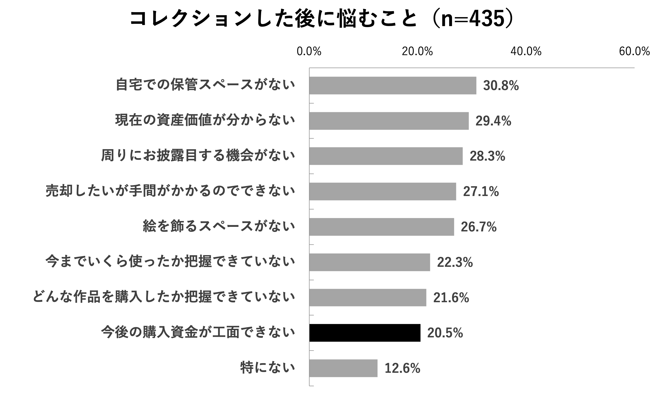 そういった中、当社がアートコレクター300名を対象にした実態調査によると、コレクションアイテムを購入する際の原資が「給与」(48.7%)、「貯蓄」(45.5%)が大勢を占める一方で、コレクション後の悩みとしては、「今後の購入資金の工面ができない」と回答する方が5人に1人も存在するなど、新たなコレクションの充実に向けた資金繰りに苦慮している状況が明らかになりました。