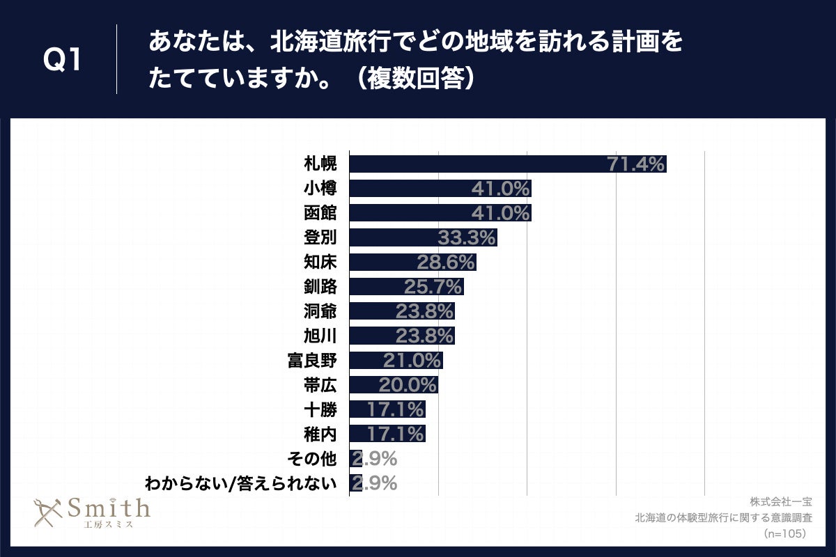 「Q1.あなたは、北海道旅行でどの地域を訪れる計画をたてていますか。(複数回答)」(n=105)と質問したところ、「札幌」が71.4%、「小樽」が41.0%、「函館」が41.0%という回答となりました。