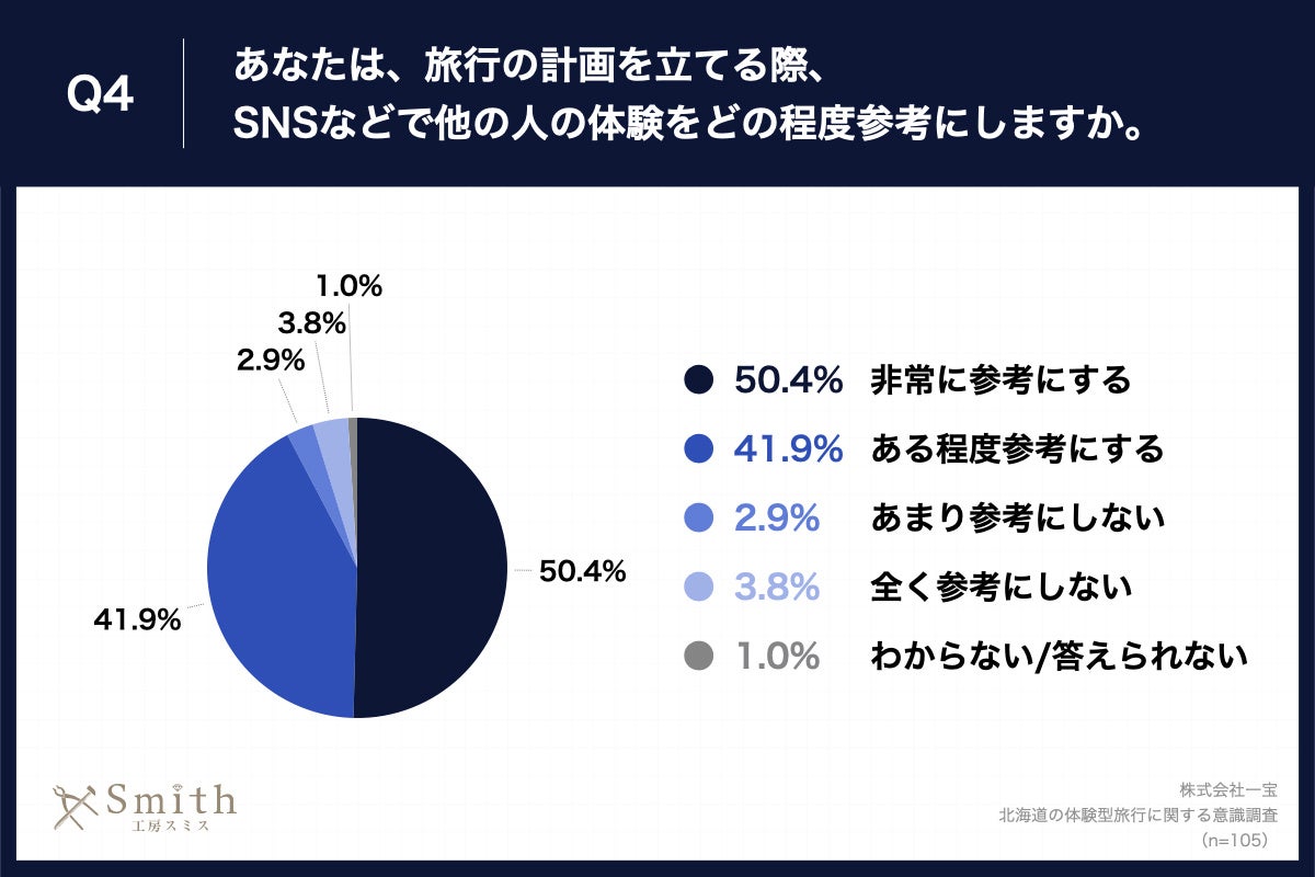 「Q4.あなたは、旅行の計画を立てる際、SNSなどで他の人の体験をどの程度参考にしますか。」(n=105)と質問したところ、「非常に参考にする」が50.4%、「ある程度参考にする」が41.9%という回答となりました。