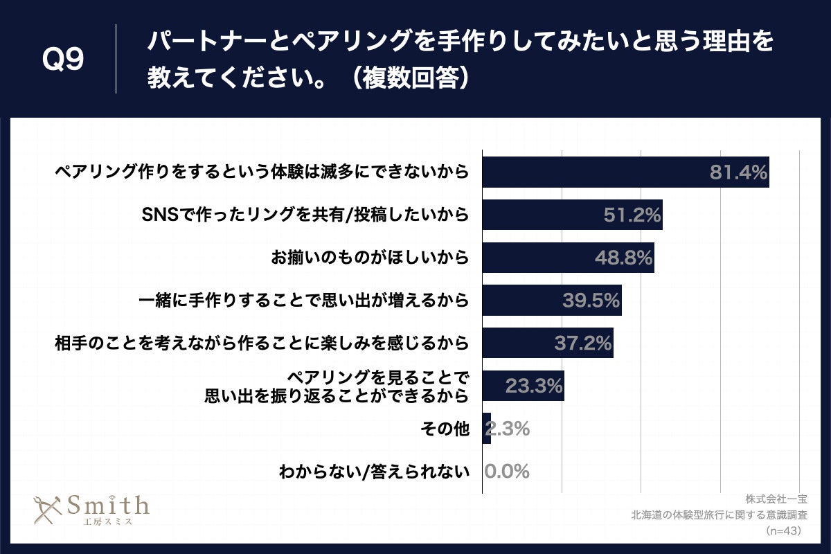 Q8で「非常に興味がある」「やや興味がある」と回答した方に、「Q9.パートナーとペアリングを手作りしてみたいと思う理由を教えてください。(複数回答)」(n=43)と質問したところ、「ペアリング作りをするという体験は滅多にできないから」が81.4%、「SNSで作ったリングを共有/投稿したいから」が51.2%、「お揃いのものがほしいから」が48.8%という回答となりました。