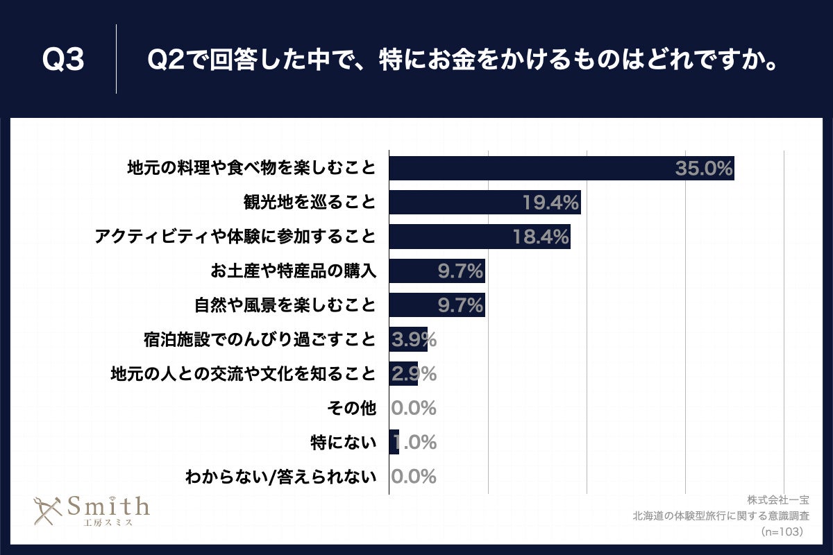 Q2で「わからない/答えられない」「特にない」以外を回答した方に、「Q3.Q2で回答した中で、特にお金をかけるものはどれですか。」(n=103)と質問したところ、「地元の料理や食べ物を楽しむこと」が35.0%、「観光地を巡ること」が19.4%、「アクティビティや体験に参加すること」が18.4%という回答となりました。