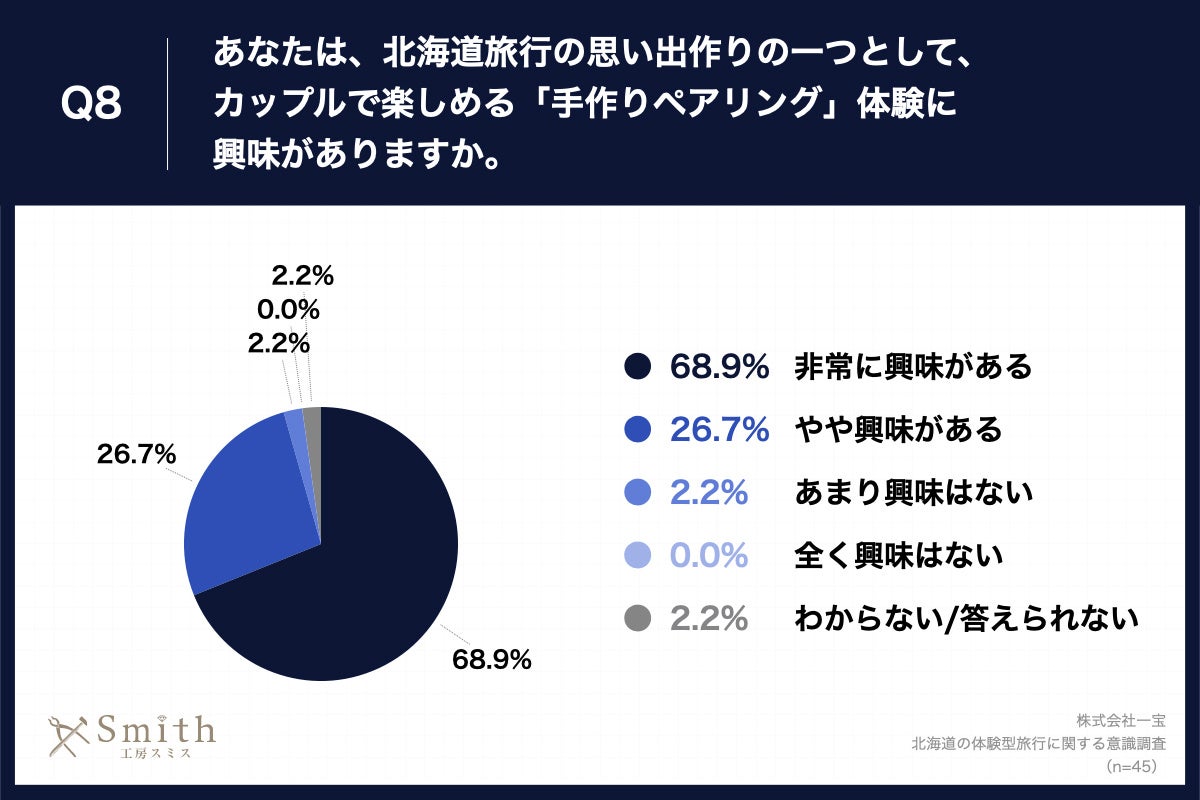 Q2で「アクティビティや体験に参加すること」と回答した方に、「Q8.あなたは、北海道旅行の思い出作りの一つとして、カップルで楽しめる「手作りペアリング」体験に興味がありますか。」(n=45)と質問したところ、「非常に興味がある」が68.9%、「やや興味がある」が26.7%という回答となりました。