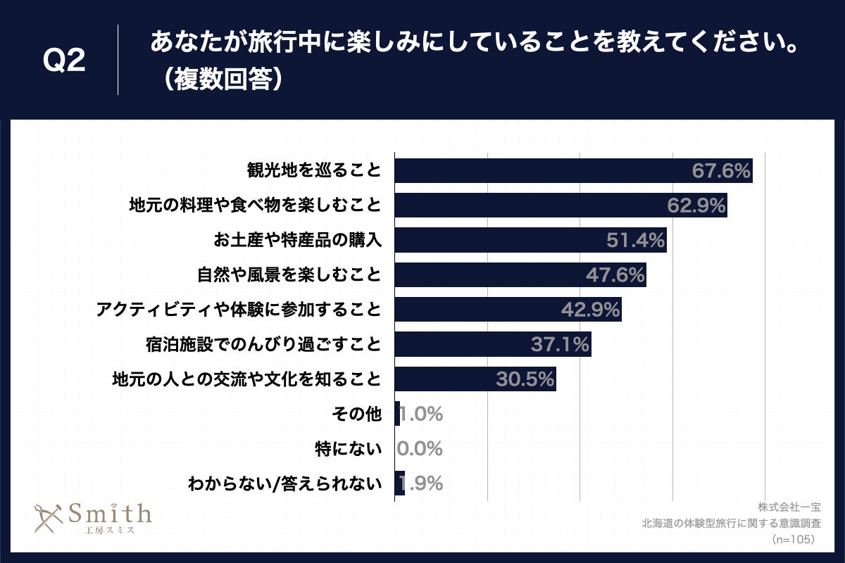 「Q2.あなたが旅行中に楽しみにしていることを教えてください。(複数回答)」(n=105)と質問したところ、「観光地を巡ること」が67.6%、「地元の料理や食べ物を楽しむこと」が62.9%、「お土産や特産品の購入」が51.4%という回答となりました。