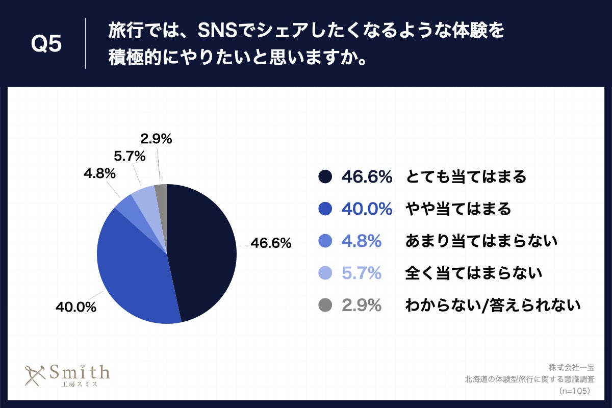 「Q5.旅行では、SNSでシェアしたくなるような体験を積極的にやりたいと思いますか。」(n=105)と質問したところ、「とても当てはまる」が46.6%、「やや当てはまる」が40.0%という回答となりました。