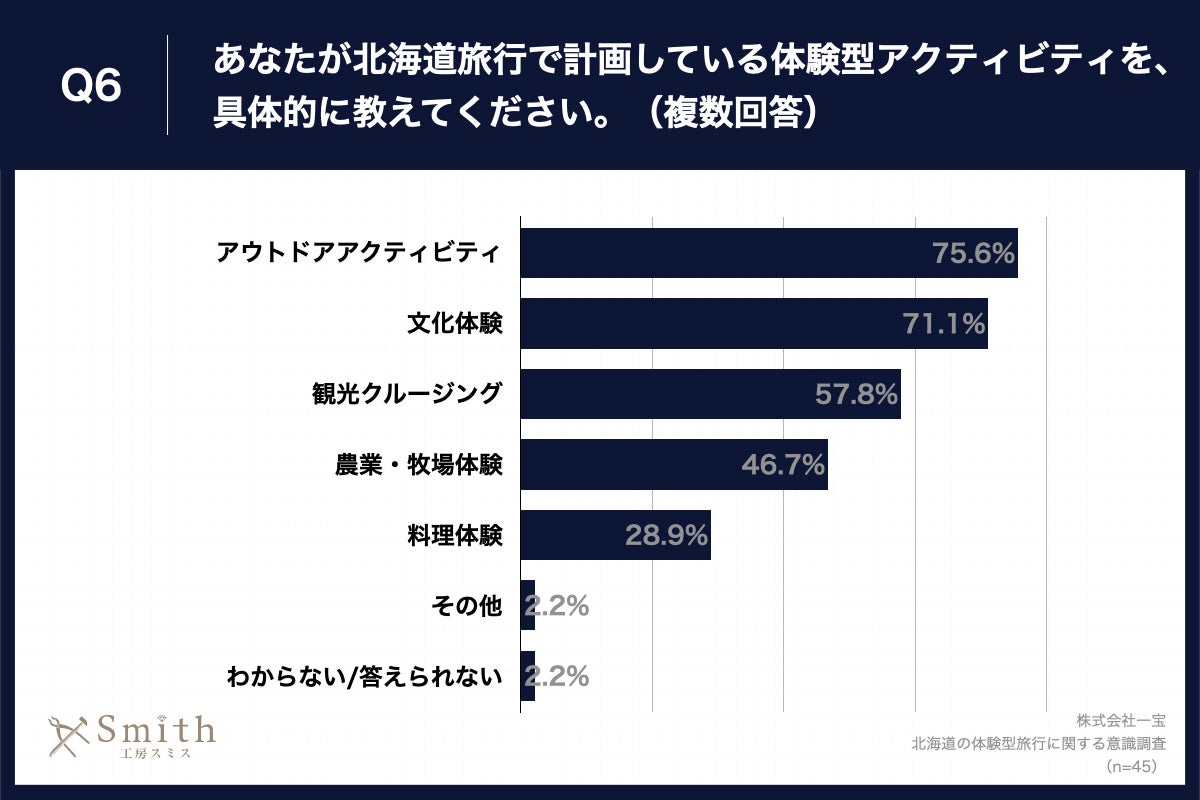 Q2で「アクティビティや体験に参加すること」と回答した方に、「Q6.あなたが北海道旅行で計画している体験型アクティビティを、具体的に教えてください。(複数回答)」(n=45)と質問したところ、「アウトドアアクティビティ(例:ラフティング、乗馬など)」が75.6%、「文化体験(例:陶芸体験、ガラス細工など)」が71.1%、「観光クルージング(例:青の洞窟、クジラウォッチングなど)」が57.8%という回答となりました。