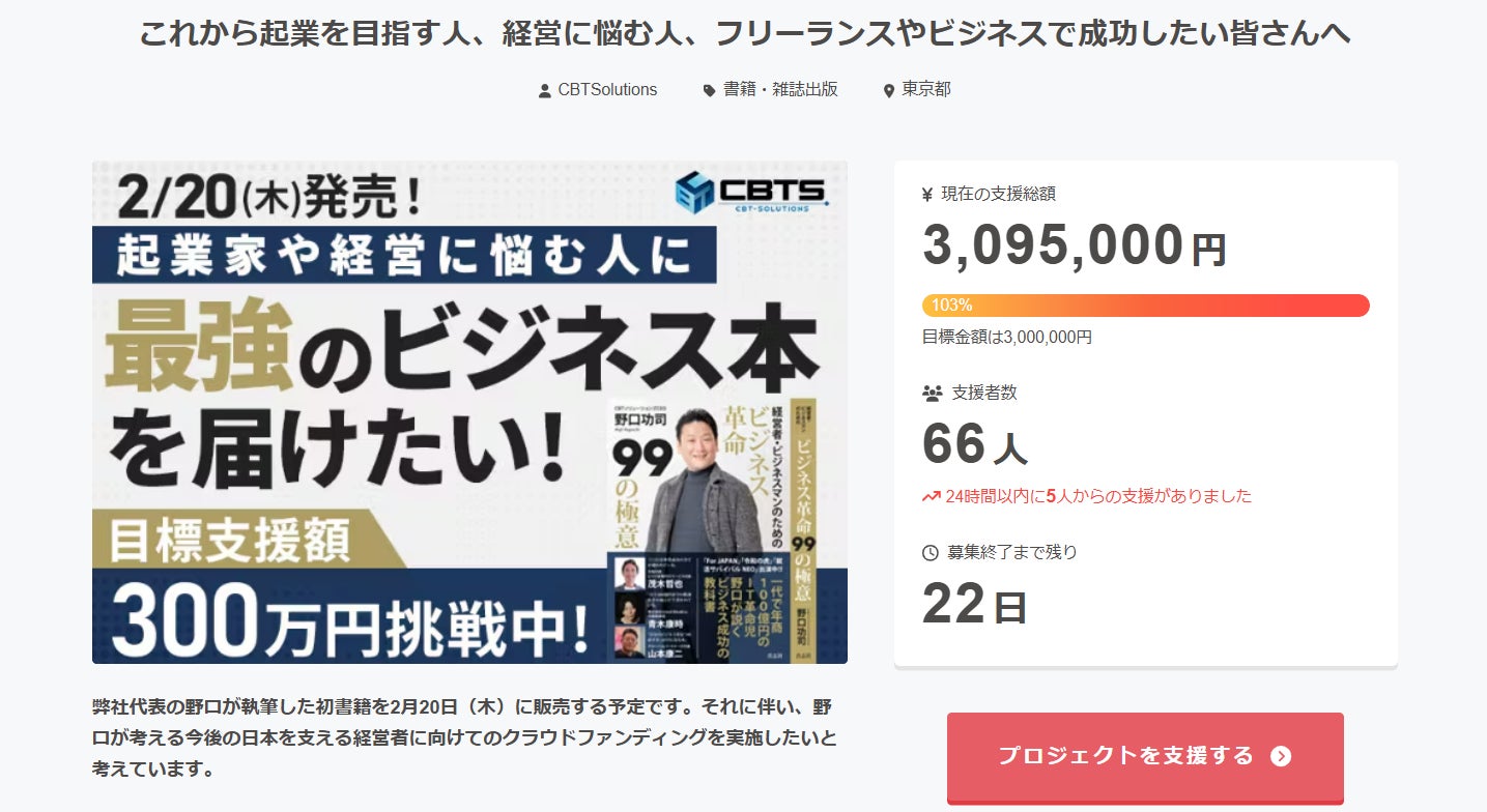 株式会社シー・ビー・ティ・ソリューションズ(本社:東京都千代田区、代表取締役社長:野口功司、以下CBTソリューションズ) の代表 野口は、初の著書『ビジネス革命 99の極意』を必要としている方に一人でも多く届けるためのクラウドファンディングを1月24日(金)12時より実施し、目標金額の300万円を達成いたしました。