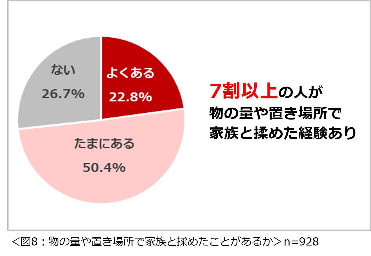 「物の量や置き場所で、家族と揉めたことはありますか?」と質問したところ、約半数の人が「たまにある」と回答、「よくある」と合わせると7割以上の人が、物の量や置き場所で家族と揉めた経験があることが分かりました。(図8)