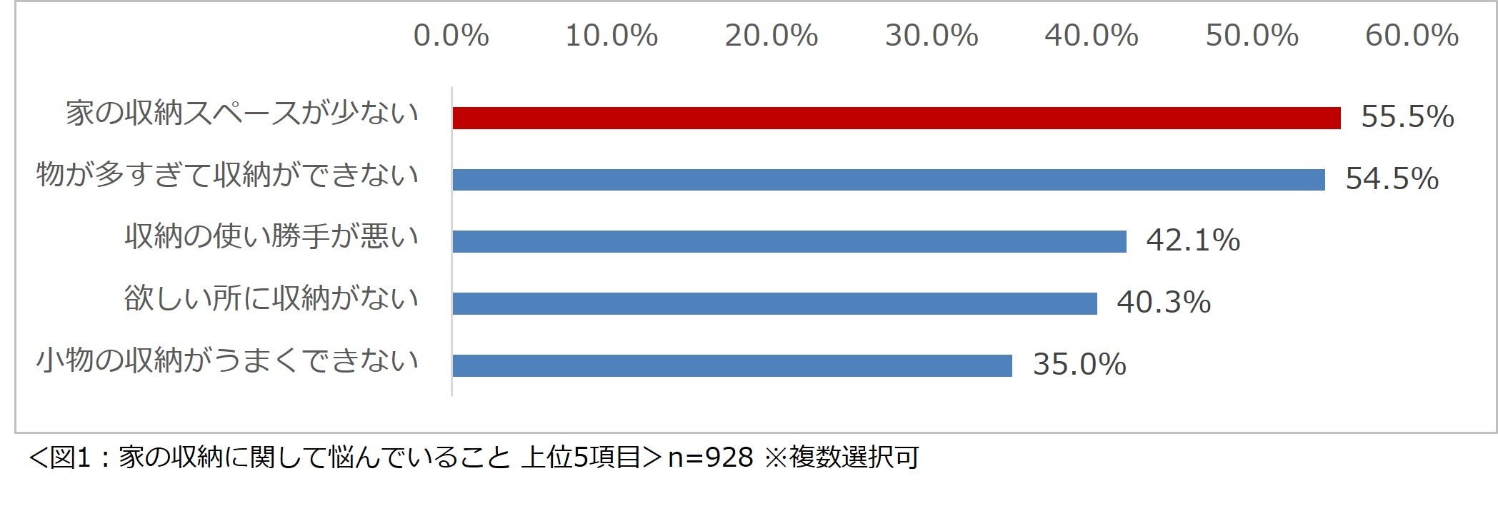 「家の収納に関して、悩んでいることはありますか?」と尋ねたところ、「家の収納スペースが少ない」(55.5%)と回答した人が最も多く、「物が多すぎて収納ができない」(54.5%)、「収納の使い勝手が悪い」(42.1%)と続きました。(図1)