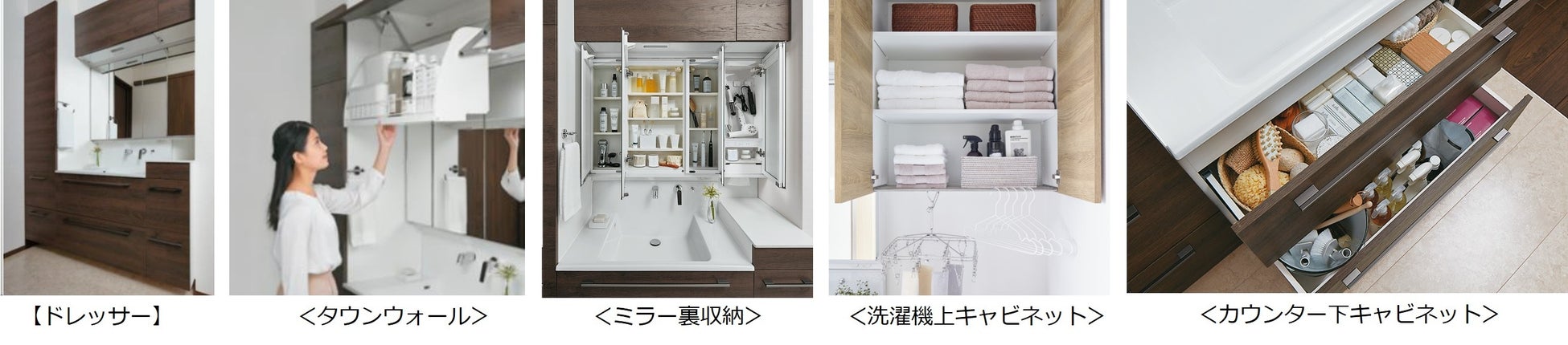 デッドスペースになりがちな空間を活用した洗濯機上キャビネットには、最下段にハンガーパイプを備え、靴下など小さなアイテムを干すこともできます。また、ドレッサー収納は、「プッシュ開閉扉」「フルスライド式のキャビネット」「耐震ロック機能」など、機能性と安全性を両立しました。