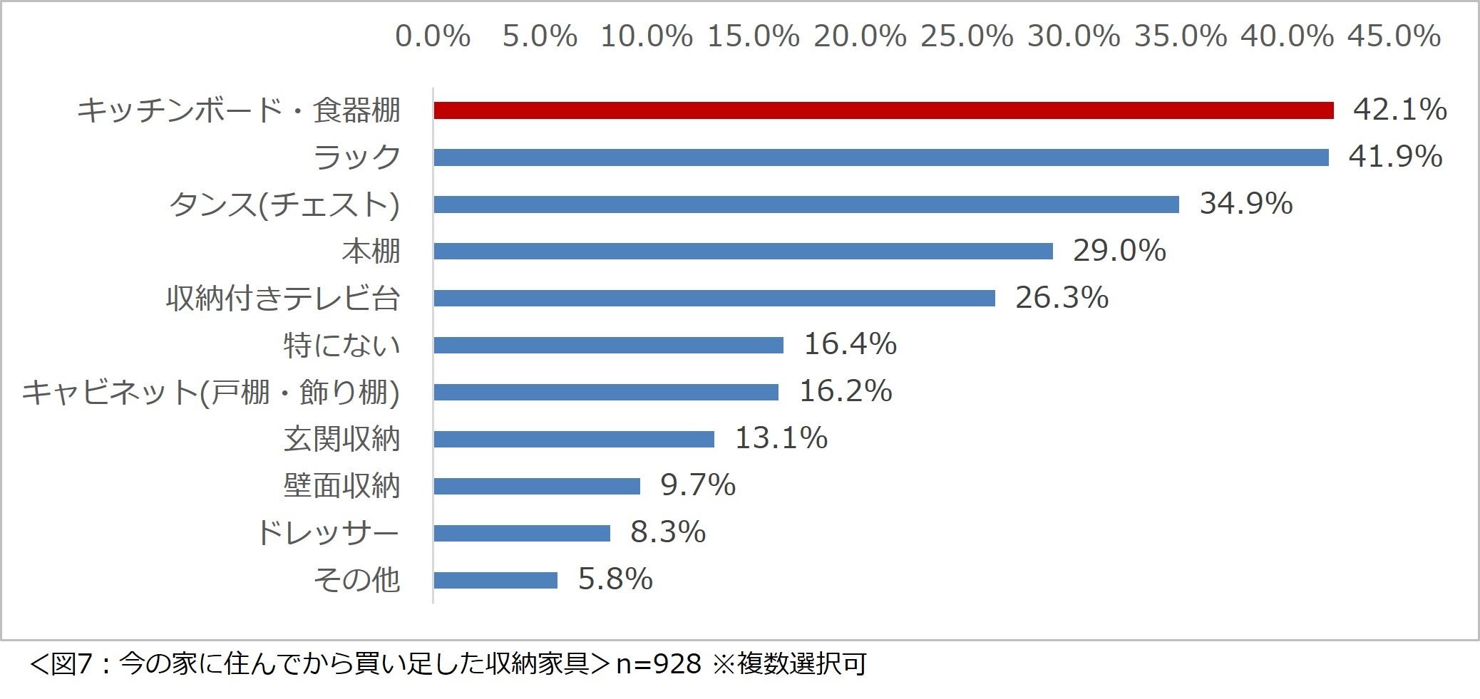 また、今の家に住んでから買い足した収納家具については、「キッチンボード・食器棚」(42.1%)という回答が最も多く、キッチン周りの収納が特に足りていないことが明確になりました。(図7)