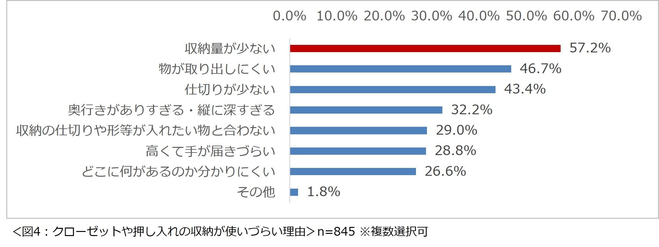 また、クローゼットや押し入れの収納が使いづらいと回答した845人にその理由について尋ねたところ 、「収納量が少ない」と答えた人が約6割で最も多く、次いで、「物が取り出しにくい」(46.7%)「仕切りが少ない」(43.4%)という回答が続きました。(図4)