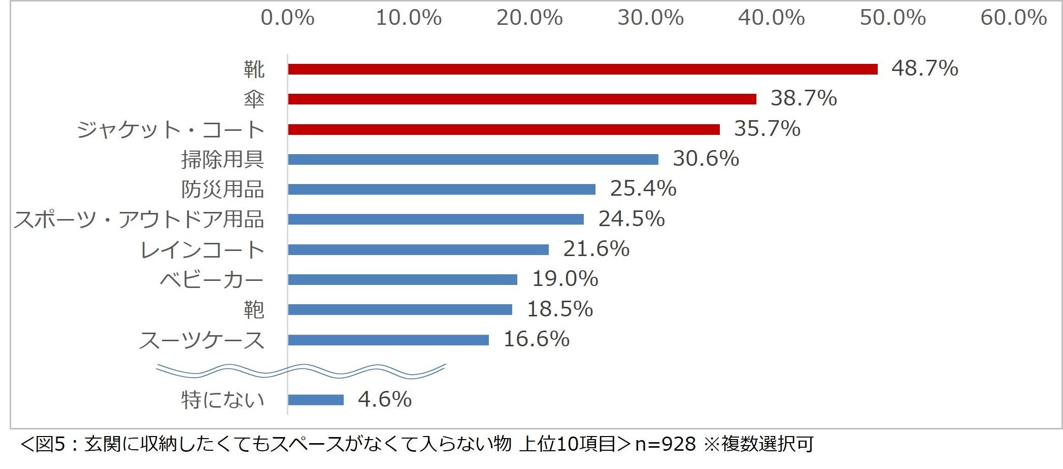 玄関に収納したくてもスペースがなくて入らない物について質問したところ、約半数の人が「靴」と回答。また「傘」(38.7%)や「ジャケット・コート」(35.7%)など雨具やアウターもできれば玄関に収納したいと考えている人が多いことが分かりました。一方で「特にない」と答えた人は5%未満という結果になりました。(図5)