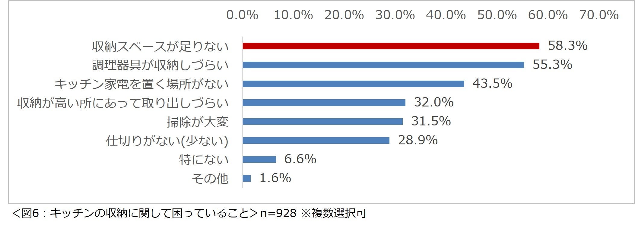 「キッチンの収納に関して、困っていることは何ですか?」と尋ねたところ、「収納スペースが足りない」と答えた人が最も多く約6割の人が回答。次いで、「調理器具が収納しづらい」(55.3%)「キッチン家電を置く場所がない」(43.5%)という回答が続きました。(図6)