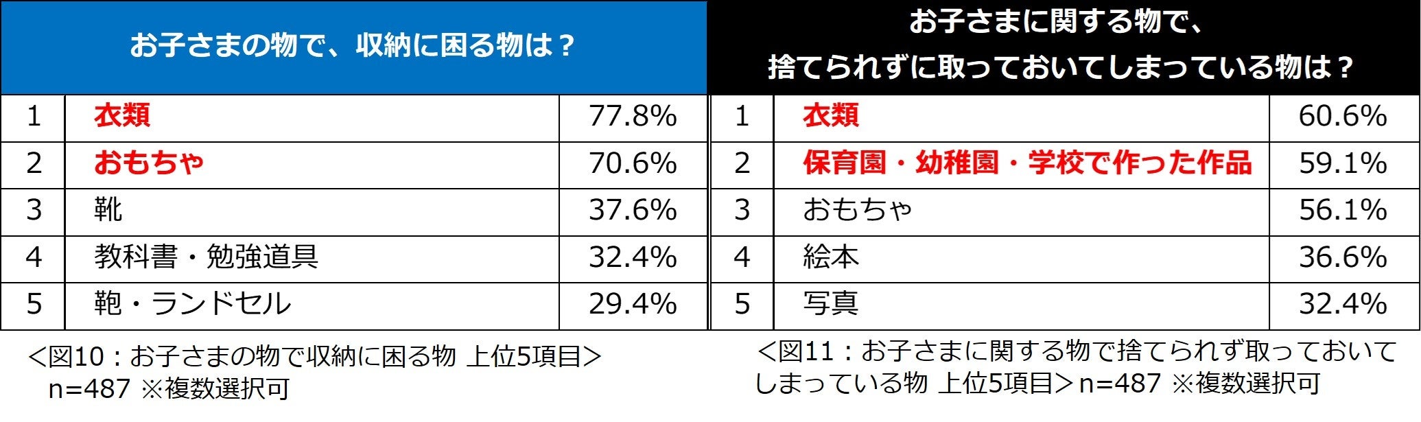 同居している家族の中に、高校生以下のお子さま(0~18歳)がいるという487名に、お子さまの物で収納に困る物について尋ねると、「衣類」が最も多く77.8%の人が回答。次いで、「おもちゃ」と回答した人も70.6%となりました。(図10)