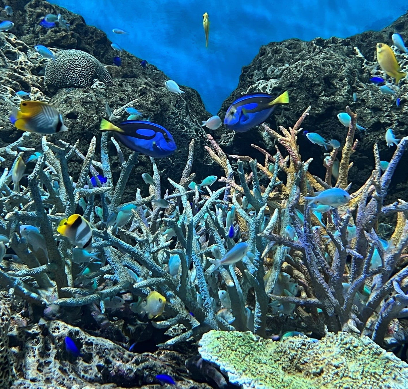この春、カラフルで華やかな小魚たちが泳ぐ「きらめく珊瑚礁の魚たち」の水槽内に水流を作り出すポンプ2台を新設したほか、擬岩・擬サンゴなどの装飾を追加し、水槽内の演出をアップデートいたしました。