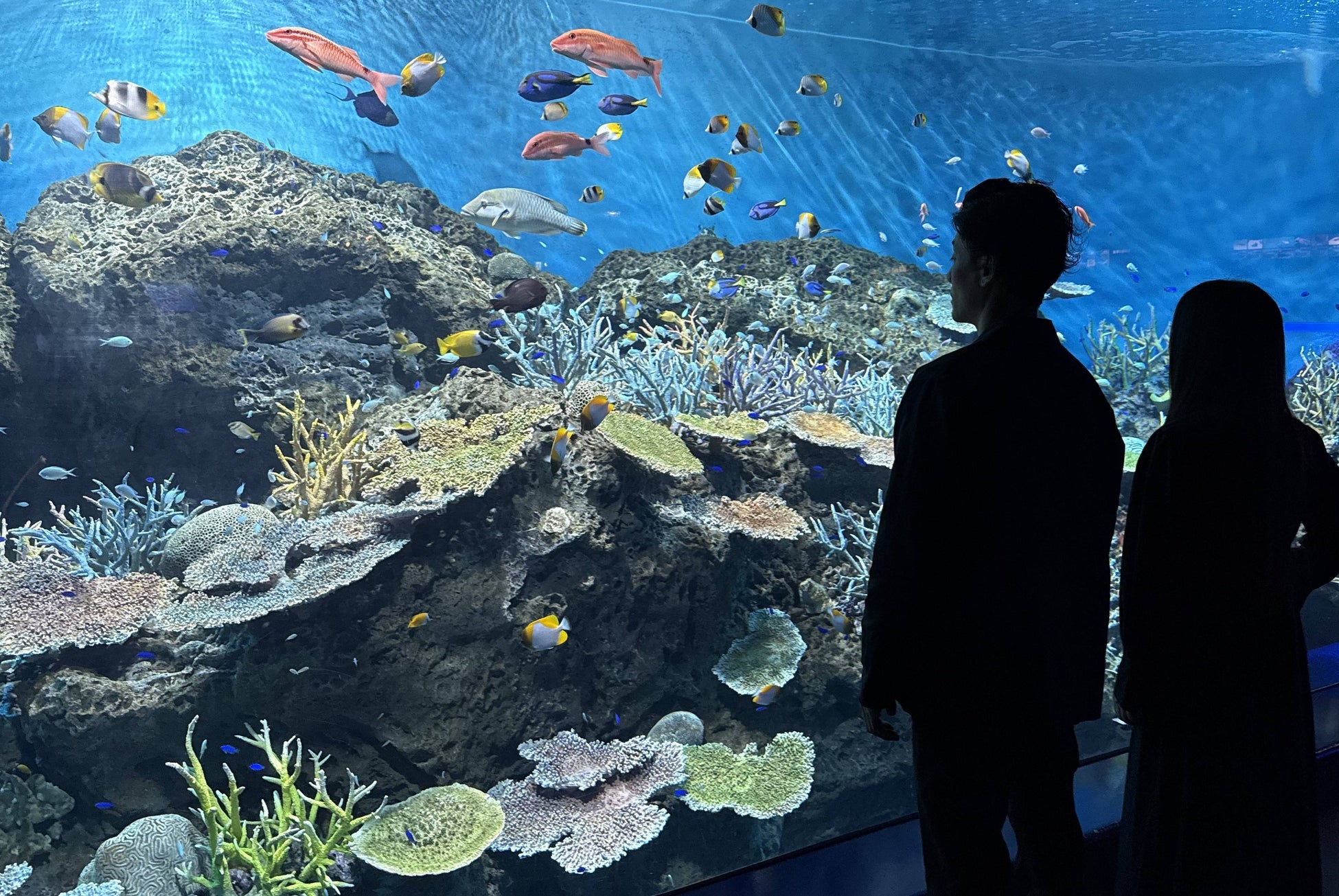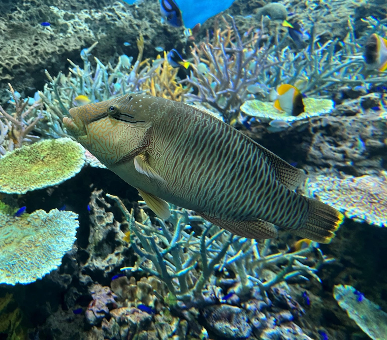 さらに、水槽内には最大1.5mまで成長する別名“ナポレオンフィッシュ”でおなじみのメガネモチノウオが新たに仲間入りしました。現在のメガネモチノウオは50cmほどのため、今後の成長を楽しみに、ぜひその姿を探してみてください。