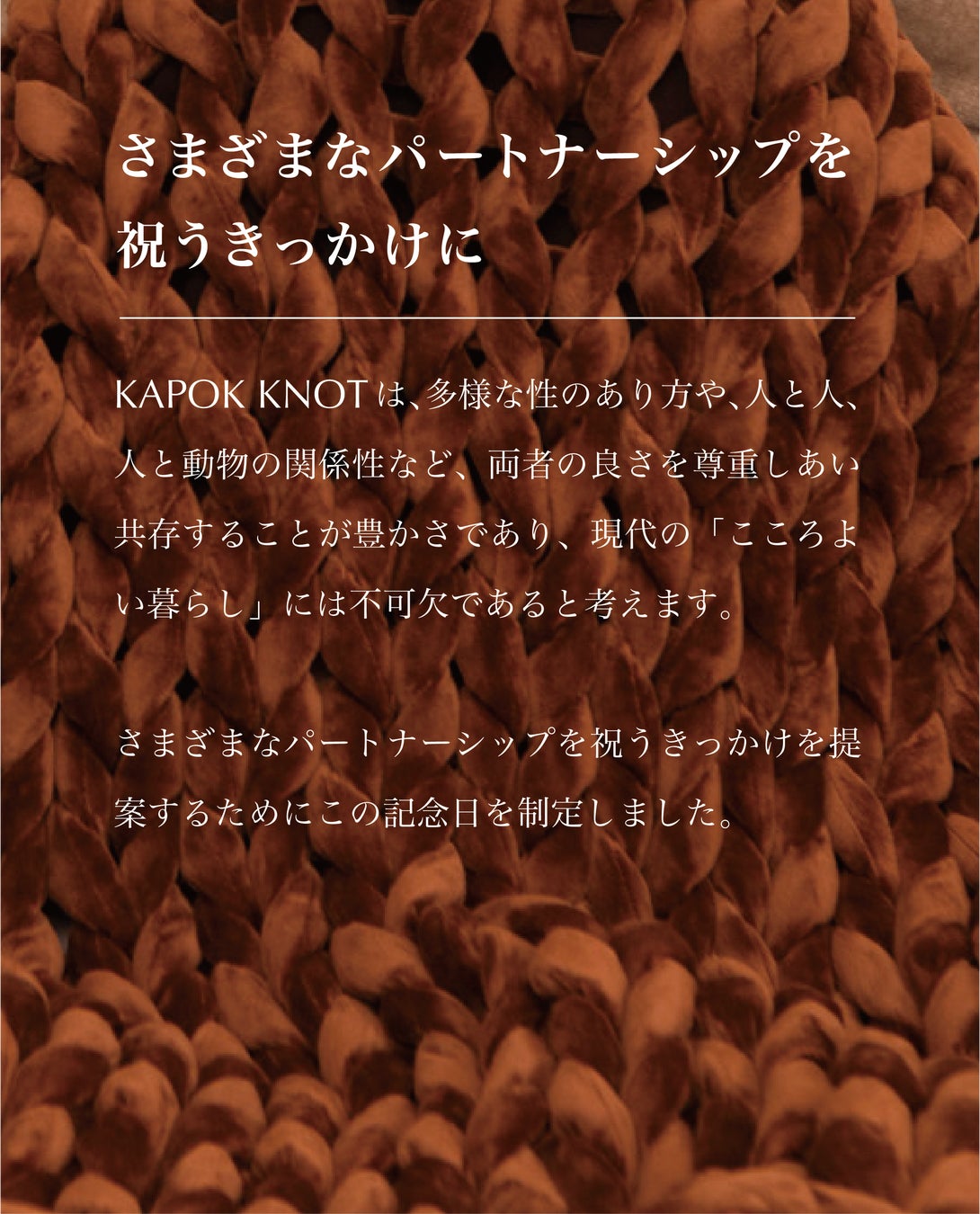 KAPOK KNOTは2019年の創業以来、「機能・デザイン・サステナブル」の3拍子を揃えた商品を展開し、こころよい暮らしを提案してきました。2022年には、11月22日の「いい夫婦の日」だけでなく、家族、恋人、友人、ペットなど、あらゆる形のパートナーシップを祝福する日として、11月8日を「いいパートナーシップの日」と制定。ブランドコンセプトである「Blur the line(境界線を曖昧にする)」に基づき、多様な関係性を尊重し、感謝を伝え合う文化を育むことを目指しています。本年もこの理念のもと、人々の心をつなぐ特別な企画を実施いたします。