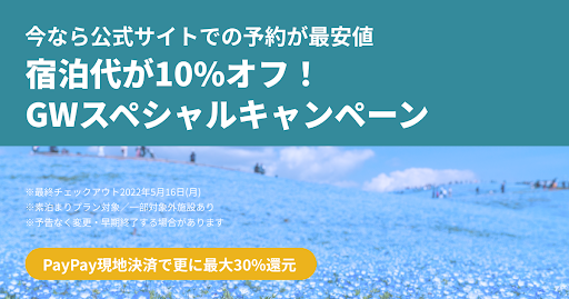 今なら公式サイトでの予約が最安値の10%オフで宿泊できるGWスペシャルキャンペーンです。PayPay現地決済で更に最大30%還元など併用が可能です。
