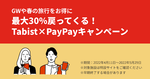 PayPay登録者は、PayPayクーポンが適用となるTabistに加盟している119の対象宿泊施設でキャンペーンを利用することが可能です。対象宿泊施設から宿泊先を予約し、事前にPayPayクーポンを取得の上、PayPayを利用して税込3,000円以上の現地決済をした場合、最大30%のPayPayポイントが後日付与されます。