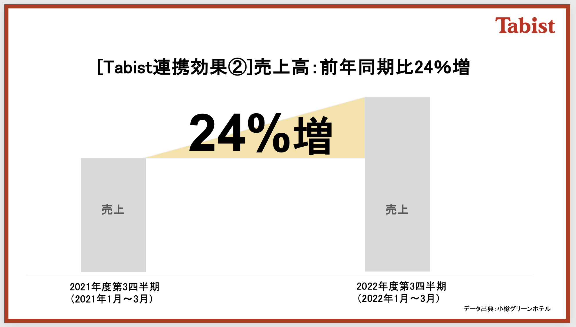 Tabistのパートナシッププログラムを通して、ダイナミックプライシングとOTAマネジメントを実施したことで、従業員のホテル勤務時間を削減したものの、単価の上昇に寄与し、小樽グリーンホテルの2022年度第3四半期(2022年1月〜3月)の売上は24%の増収(前年同期比:2021年1月〜3月)の達成に貢献しました。