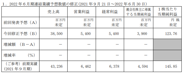 通期の連結業績予想につきましては、決算期変更の経過期間となる第50期事業年度が、2021年9月21日から2022年6月30日までの9か月10日間となるため、2021年10月29日に公表した業績予想を一旦取り下げ、「未定」としておりましたが、通期の予想数値が確定したため、公表いたします。