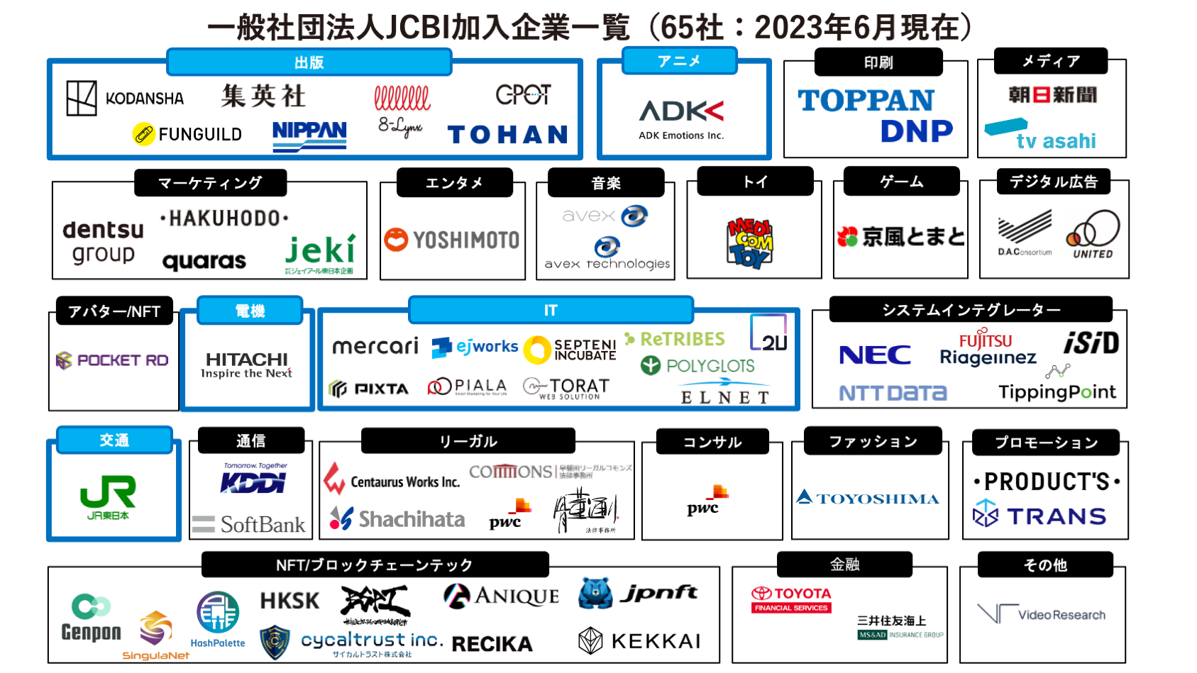 一般社団法人JCBIは、ブロックチェーン等の先端技術を基点として、日本のメディア・コンテンツ業界のデジタルトランスフォーメーションを業界横断で加速するための企業連合です。2020年2月に7社で共同発足したのち、多くの業界各社に加入いただき、今回さらに新たに5社が加わったことにより、加盟企業は65社にまで拡大しました。