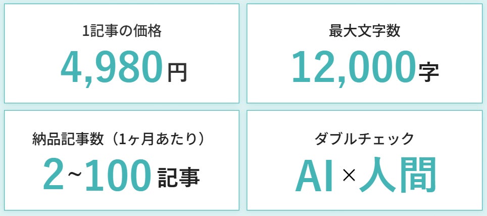 AI技術で1記事4,980円(※月2記事~)という価格を実現。それでも品質には妥協しません。月々たった9,960円から始められる「成果重視のSEO」。
