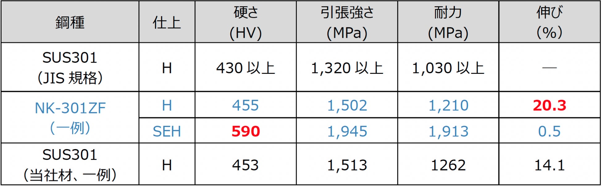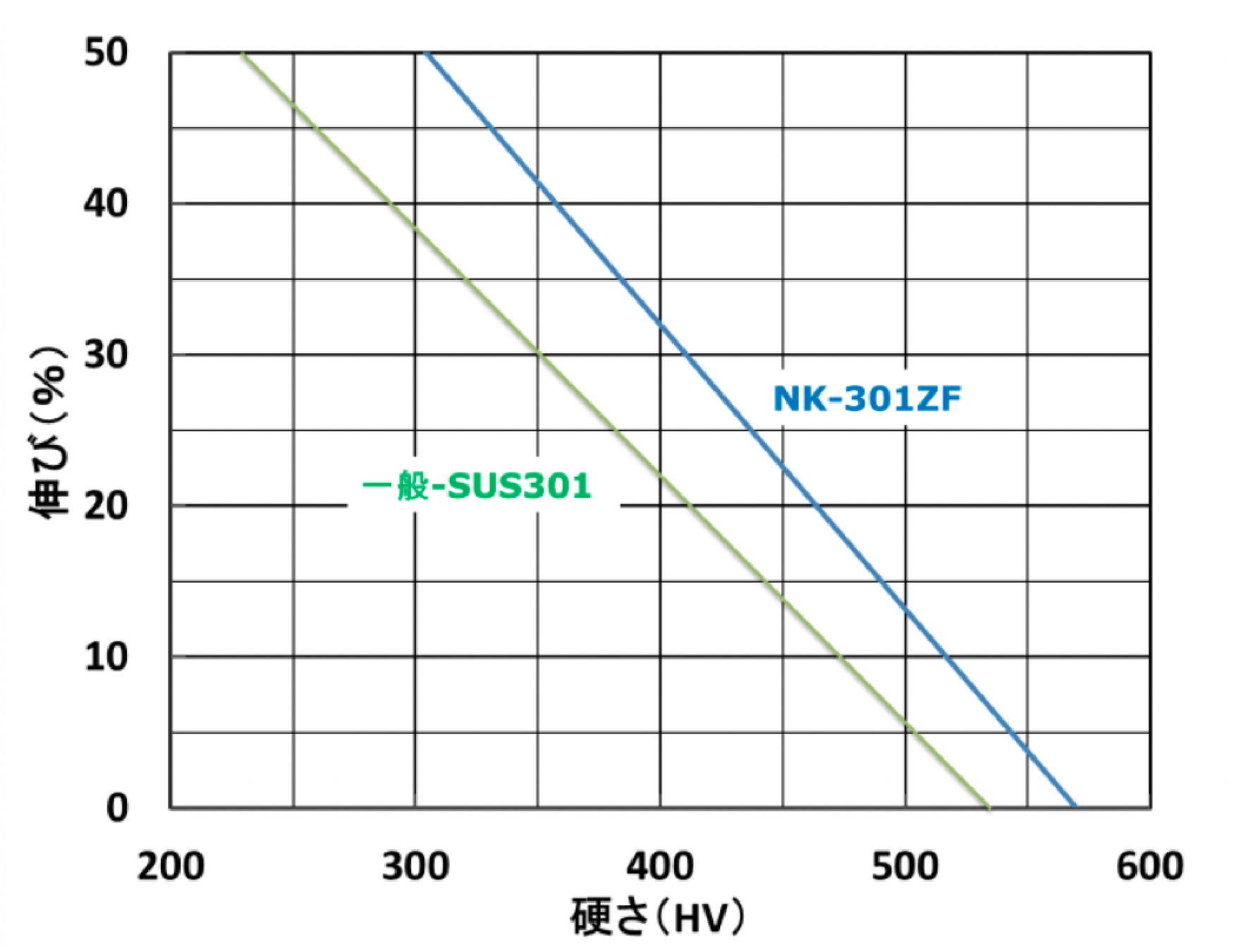 従来のSUS301よりも伸びが高く、加工割れ防止が図れます。硬さHV580以上も狙える高強度材です(表2)。 同一強度(硬さ)では、従来のSUS301よりも伸びが高く、延性に優れています(図2)。