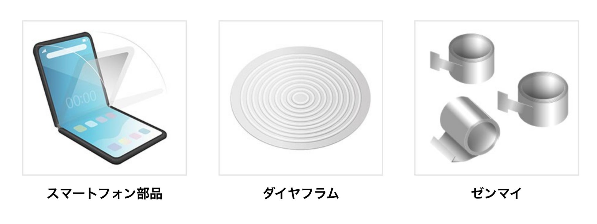 NK-301ZFは、高強度と高延性を兼ね備えたことで、部品の軽量化や工程の省略が可能となり、お客様の製造プロセス全体におけるエネルギー効率向上と環境負荷軽減に寄与します。さらに、製品設計の自由度が高まることで、形状や仕様の最適化が可能となり、加工効率の向上や歩留改善にも貢献します。こうした特性を活かし、図1に示す各種用途においてご活用いただいております。