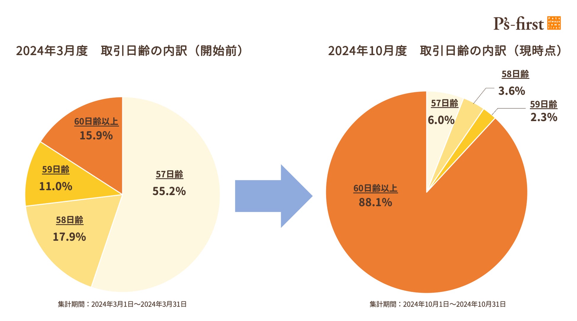 当社取引内における⽣後60⽇齢以上の割合は、取り組み開始以前の本年3月度時点では15.9%であったのに対し、10⽉度は88.1%へ大きく増加しました。今後もこの取り組みを続け、2025年2月末までには、子犬猫ともに生後60日齢以上の取引割合を100%とする予定です。