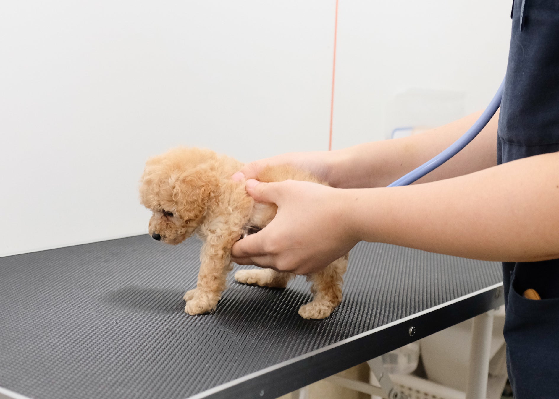 契約ブリーダーから直接取引したペットたちはすぐに店舗に行くのではなく、一度ウェルネス管理センターに集められ健康チェックや予防接種を行います。健康チェックでは獣医師・愛玩動物看護師などが身体検査、糞便検査、血液検査、レントゲン検査などを必要に応じて実施し、子犬・子猫の健康状態を詳しく確認します。また、混合ワクチンをはじめとした予防接種を行い、感染症からペットを守っています。