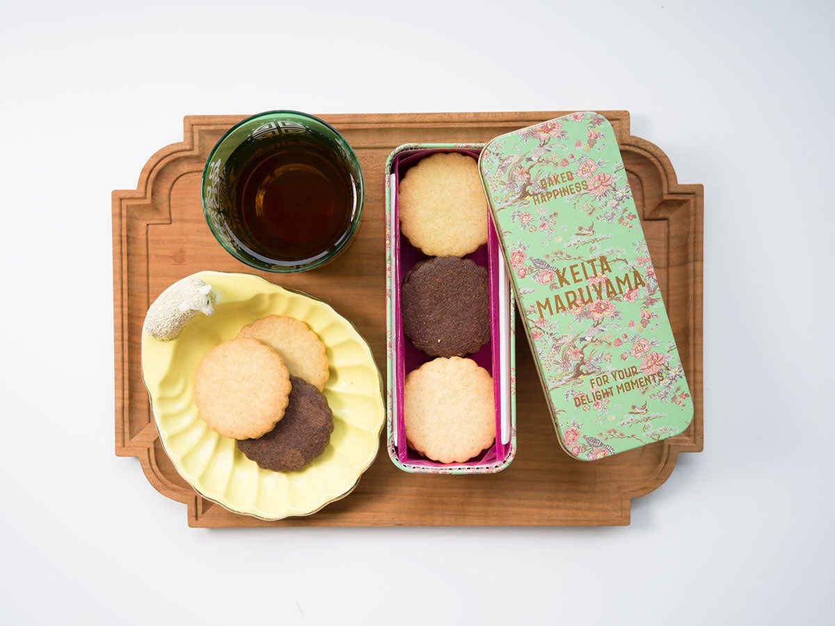 KEITAMARUYAMAのアーカイヴの中から厳選した柄をプリントした缶に、こだわりの味わいと美しい見た目のクッキーを詰め合わせたクッキー缶は、「相手のことを想いながら選んだものを、おいしく召し上がってほしい」という日本人ならではの「おもたせ」の精神を紡いでいきたいという、デザイナー・丸山敬太の想いをこめたシリーズです。